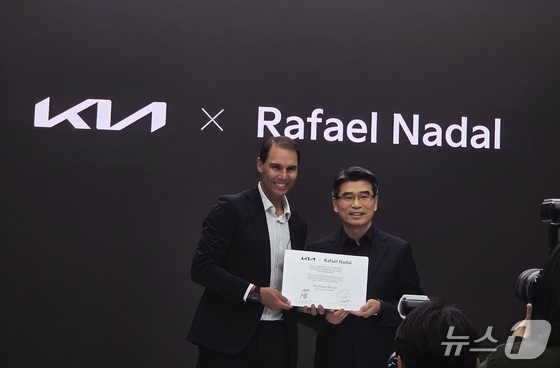 일 서울 성동구에 위치한 브랜드 체험 공간 '기아 언플러그드 그라운드'에서 기아 송호성 사장왼쪽과 테니스 선수 라파엘 나달이 공식 후원 파트너십을 …