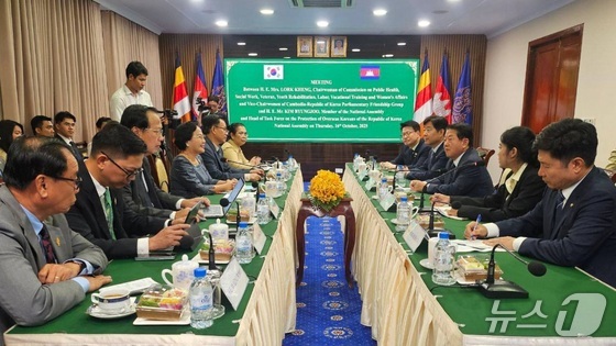 더불어민주당 재외국민안전대책단이 일현지시간 캄보디아 프놈펜의 의회를 찾아 하원 의원들과 한국인 대상 납치·감금 사태와 관련한 회의를 하고 있다. …