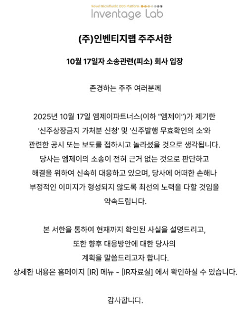 엠제이파트너스, 인벤티지랩에 제기한 신주발행무효 소송 취하