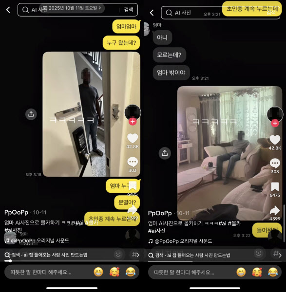 [이데일리 김윤정 기자] 최근 사회관계망서비스(SNS)에서 ‘낯선 사람이 우리 집에’라는 이름의 몰래 카메라형 콘텐츠가 확산하고 있다. 생성형 인공지능(AI)을 이용해 집 안 풍경