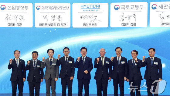이재명 대통령과 정의선 현대자동차 회장이 27일 전북 군산시 새만금 컨벤션센터에서 열린 새만금 로봇·수소·AI 시티 투자협약식에서 투자협약을 체결한 뒤 기념촬영을 하고 …