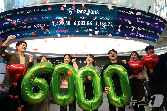 코스피가 종가 기준 사상 처음 6000선을 돌파한 25일 오후 서울 중구 하나은행 본점 딜링룸에서 직원들이 축하 세리머니를 하고 있다. 2026.2.25 뉴…