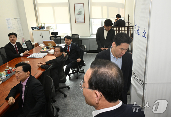 26일 서울 여의도 국회 국민의힘 원내수석부대표실에서 대구·경북 지역구 의원들이 대구·경북 행정통합 특별법안 처리에 대한 입장 정리를 위해 모여있다. 2026.2.26 …
