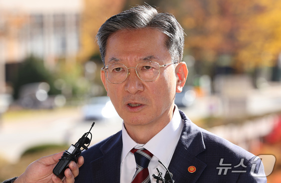 정성호 법무부 장관이 10일 오전 경기 정부과천청사 법무부 출입구에서 최근 검찰이 대장동 개발비리 의혹 사건 1심 선고에 대한 항소를 포기한 것과 관련한 입장을 밝히고 …