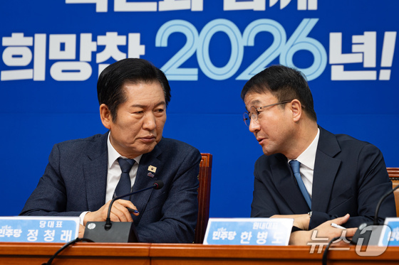 정청래 더불어민주당 대표와 한병도 신임 원내대표가 지난 12일 서울 여의도 국회에서 열린 최고위원회의에서 대화하고 있다. 2026.1.12/뉴스1 News1…