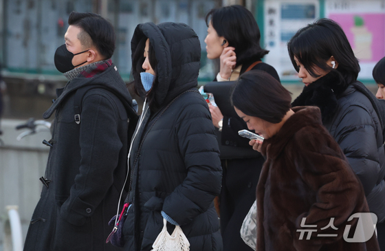 3일 오전 전국의 기온이 영하권으로 떨어지며 출근길 추위가 찾아온 가운데 서울 광화문 네거리에서 시민들이 잔뜩 움츠린 채 이동하고 있다. 기상청에 따르면 이날 제주를 제…