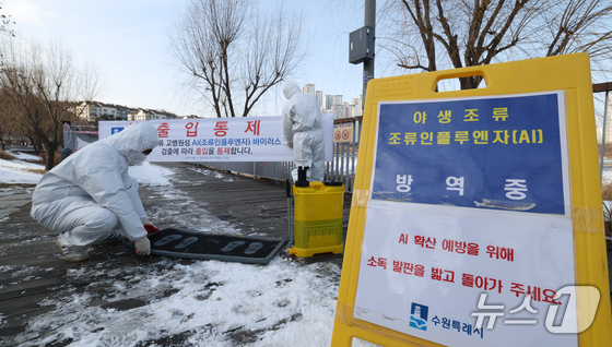 지난달 19일 경기 수원시 영통구 원천호수 일대에서 고병원성 조류인플루엔자AI가 발생해 관계자들이 나무데크길 일부 구간의 출입을 통제하고 방역 작업을 …