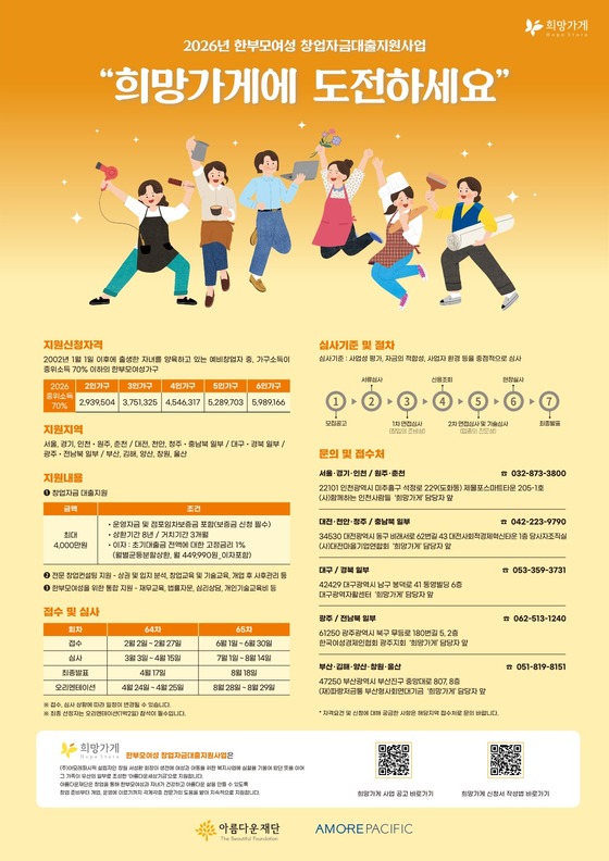 아모레퍼시픽은 아름다운재단과 함께 한부모 여성 창업자금 대출지원사업 '희망가게' 창업주를 27일까지 공개 모집한다.아모레퍼시픽제공아모레퍼시픽…