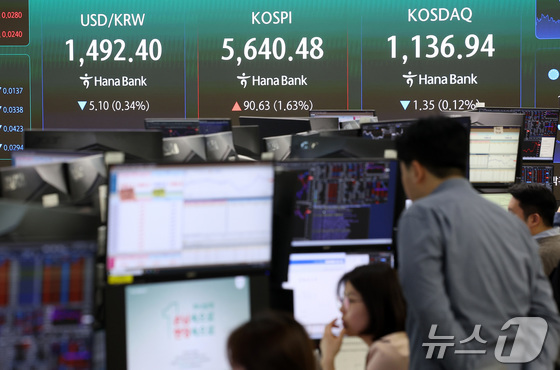 17일 서울 중구 하나은행 본점 딜링룸 전광판에 종가가 표시되고 있다. 이날 코스피는 전일 종가와 비교해 90.63포인트1.63% 상승한 5640.48…