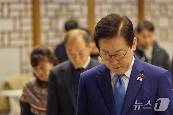 이재명 대통령이 26일 서울 용산 대통령실 청사에서 열린 위험직무 순직 유가족 초청 오찬에서 묵념을 하고 있다. 대통령실 제공. 재판매 및 DB 금지 …