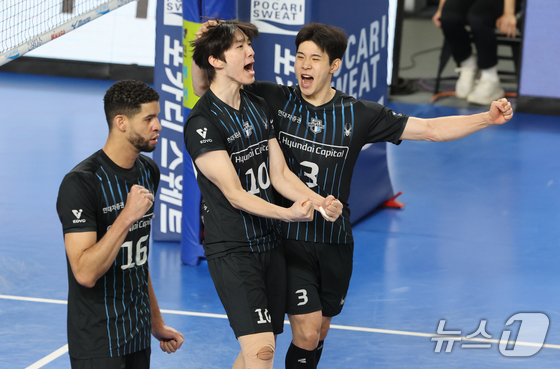 8일 충남 천안 유관순체육관에서 열린 프로배구 2025-2026 V리그 남자부 챔피언 결정전 4차전 대한항공과 현대캐피탈의 경기에서 현대캐피탈 선수들이 환호하고 있다. …
